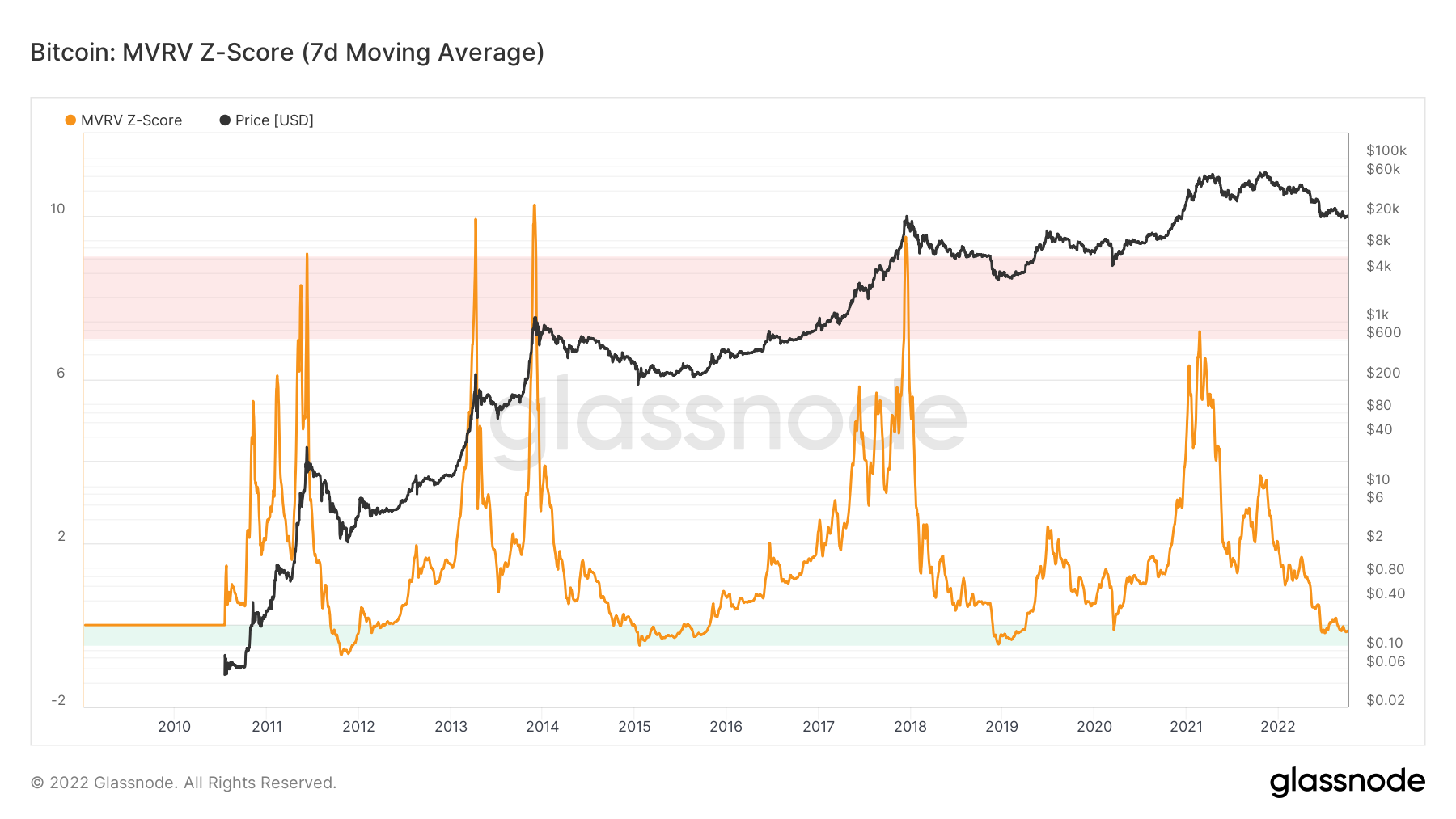 Il presente indicatore viene utilizzato per valutare quando Bitcoin è sopra/sottovalutato rispetto al suo "fair value", rappresentato dal prezzo medio di acquisto di tutti i bitcoin in circolazione (realized price). In questo momento l’indicatore mostra una opportunità di acquisto simile a quella dei precedenti minimi registrati da Bitcoin nel 2015 e nel 2018.